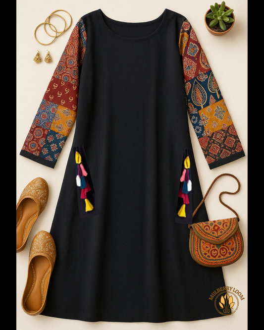 Midnight Mosaic — Black Dress with Ajrakh Patchwork Sleeves