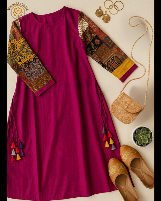 Midnight Mosaic — Plum Dress with Ajrakh Patchwork Sleeves