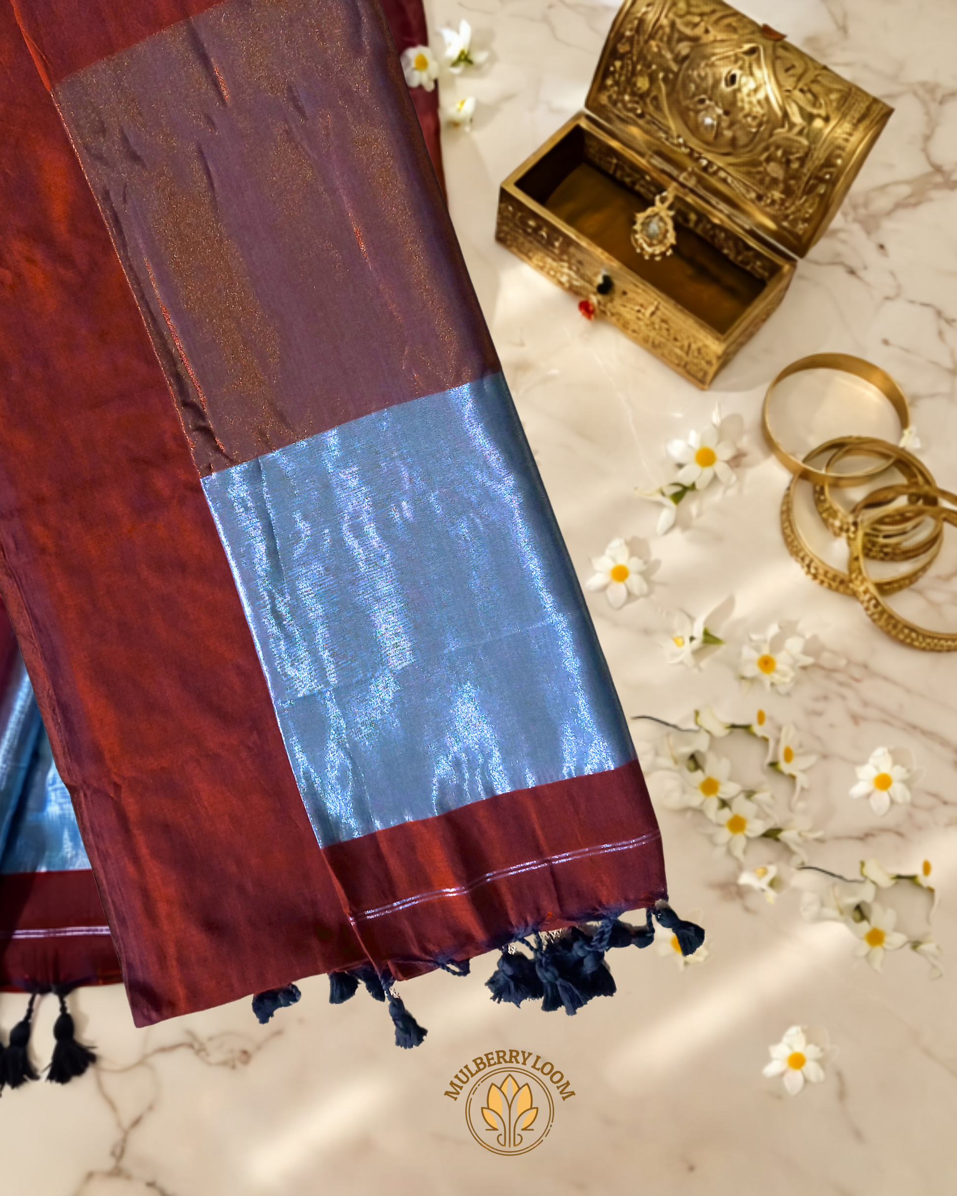 The body of the saree is kept completely plain, allowing the richness of the maroon hue to take center stage—uninterrupted and bold..What makes this saree truly special is its stunning pallu—subtly shimmering in copper and silver threads, adding a sophisticated contrast to the deep maroon body. The play of metallic tones brings a soft festive glow while staying rooted in classic charm.