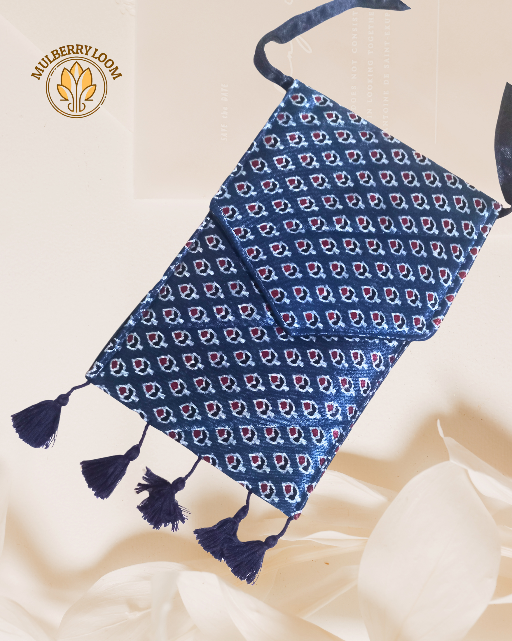 Our Mobile Ajrakh Slings are made using authentic handblock-printed Ajrakh Mashru fabric.